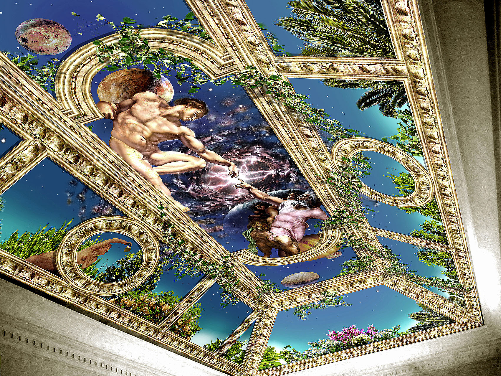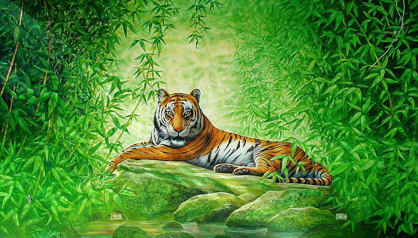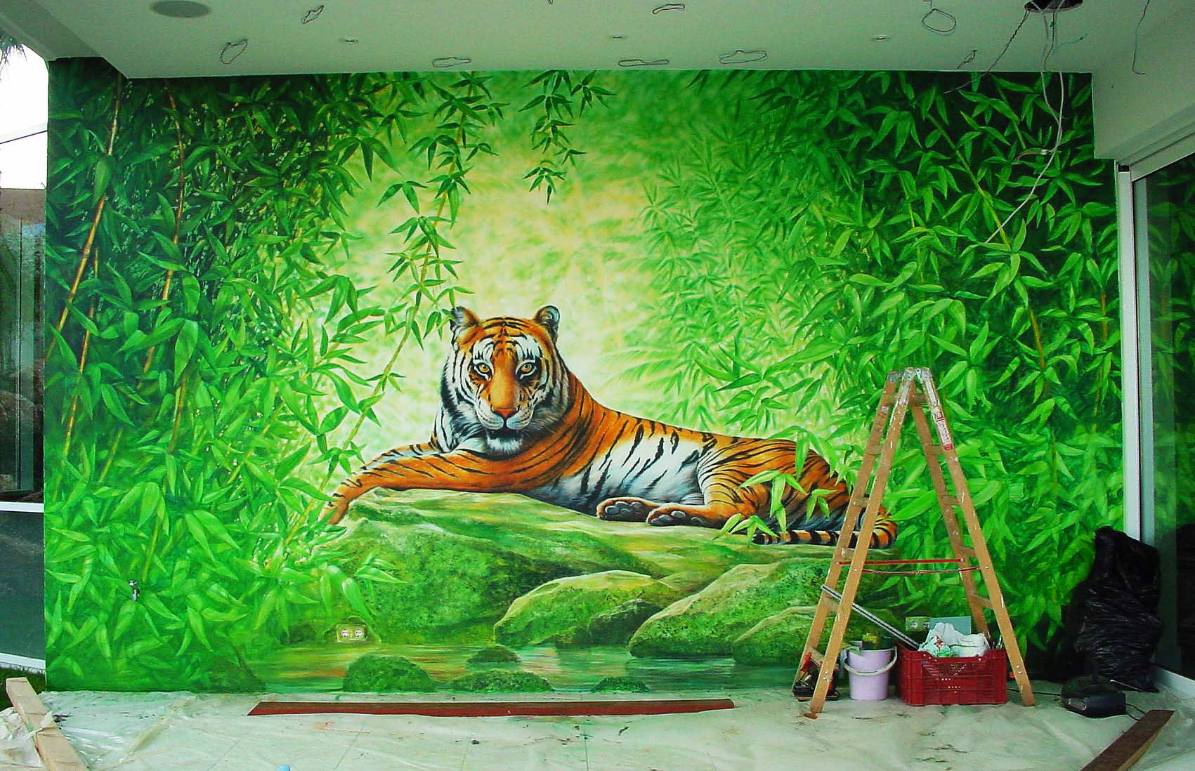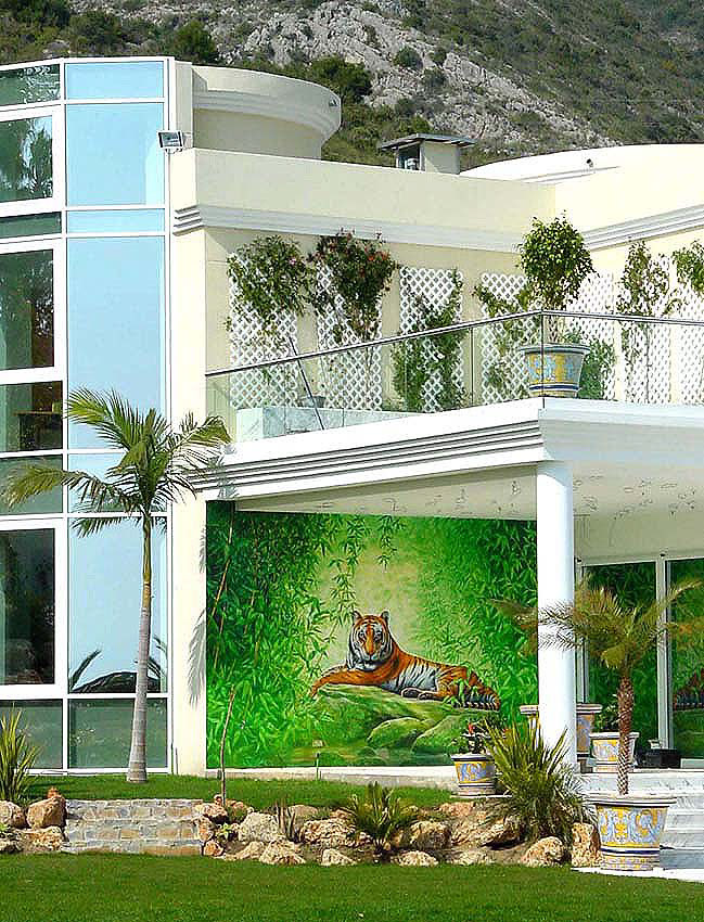 A selection of mural commissions including a tiger on the wall of a millionaire's mansion in Marbella, a series of wall panels for a hot tub and jacuzzi room in Tangiers, a scary shark at the bottom of a pool, a creation-scene ceiling mural for another Marbella mansion and murals for two investment companies boxes at Twickenham rugby ground.